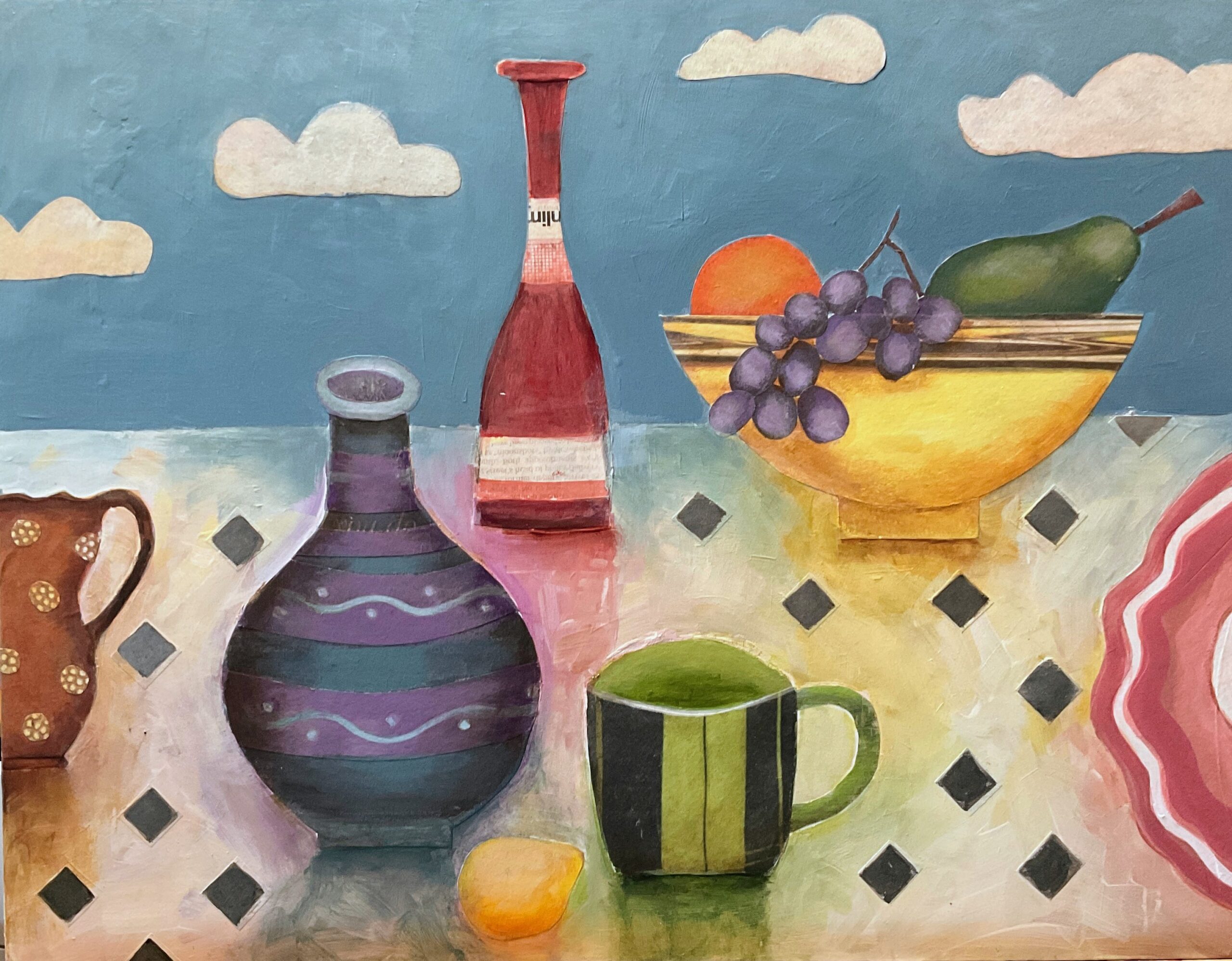 Mixed media, acrylic and collage, on wood, 56 x 46 cms