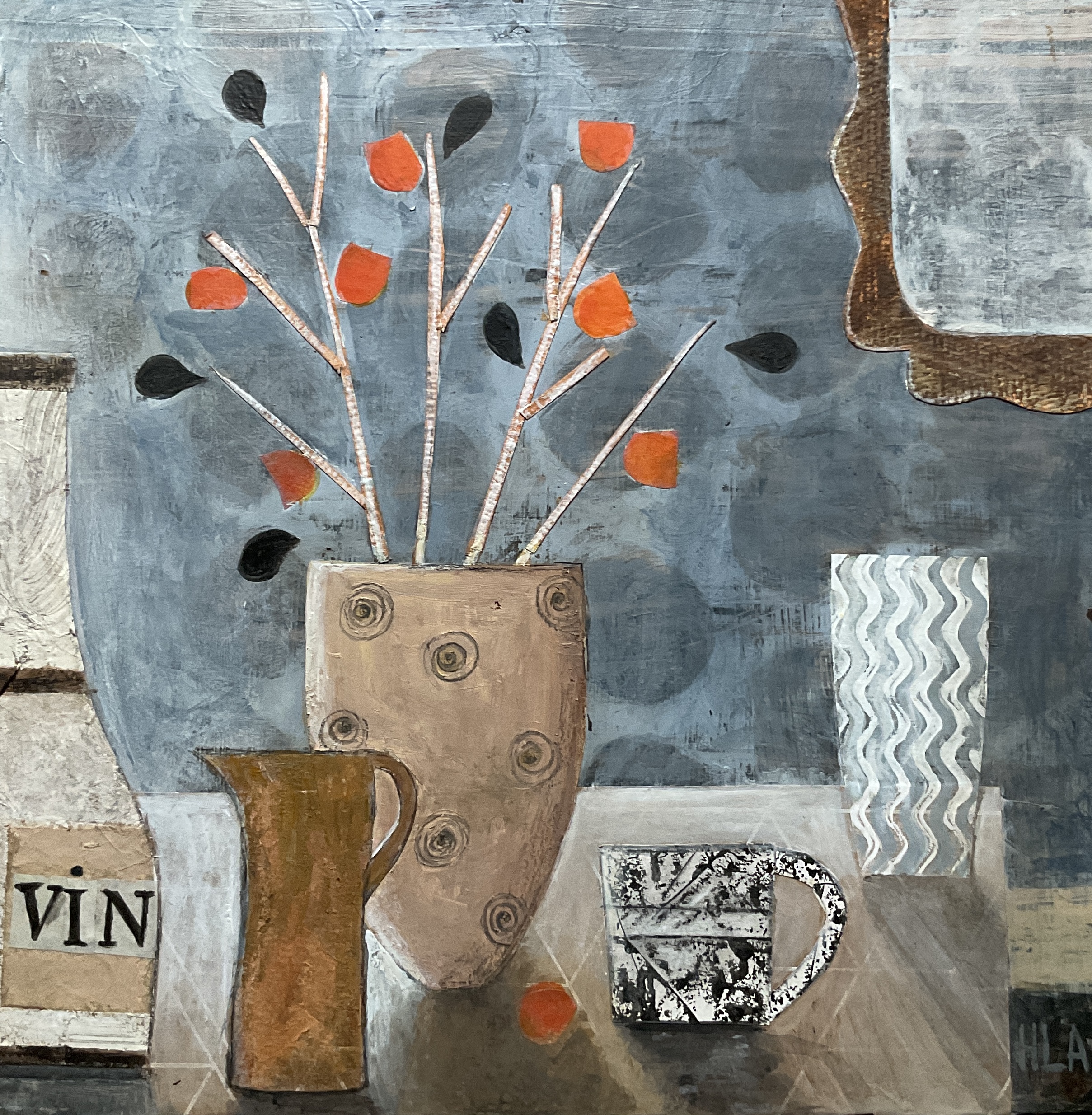 Acrylic and collage on board, 9 x 9 ins, framed.